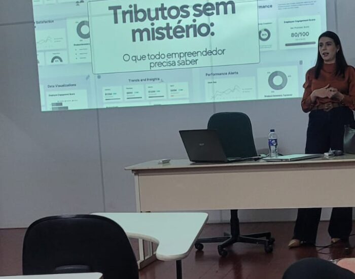A contadora Amanda Kunzler apresentou a palestra “Tributos sem Mistério” para os participantes do Projeto Empreendedores em Ação na noite de ontem. O projeto, promovido pela Acit e realizado pela Coeducars, acontece às terças-feiras à noite no Instituto Cônego Bento, com a participação de indicados pelas empresas associadas da Acit.